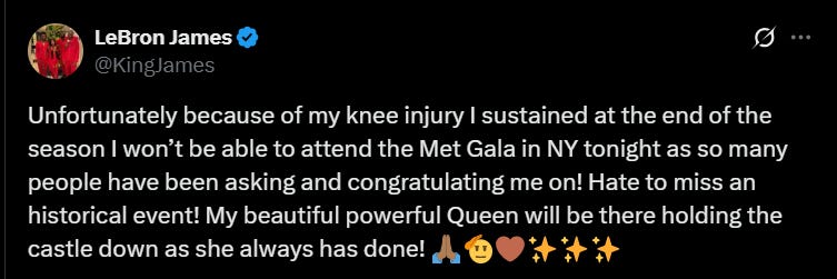 Still, the Met won’t be completely James-less. His wife, Savannah James, is attending solo and has already teased her glam look on Instagram.