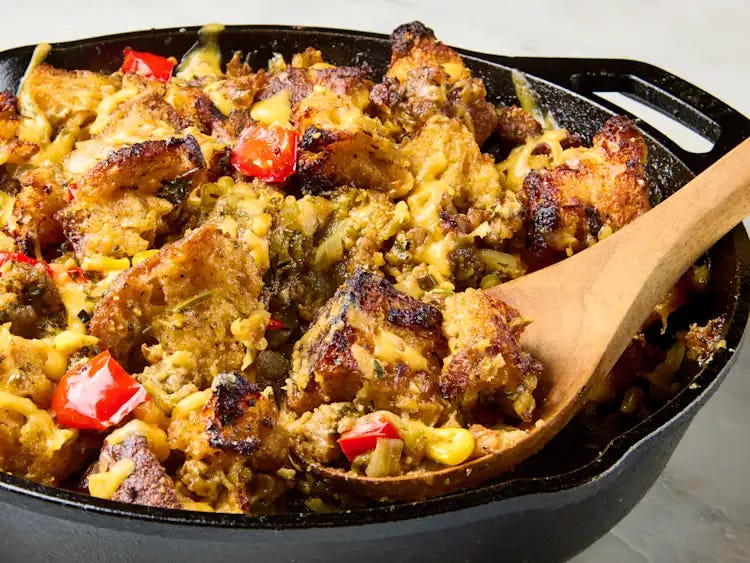 Let’s talk about something that’s going to steal the show at your next holiday dinner - Cowboy Stuffing. It’s a fun, flavorful twist on the classic stuffing, combining all the usual suspects: bread, sausage, and thyme, with some bold flavors like green chiles, jalapeños, and chili powder. Oh, and we top it all off with a melty layer of cheddar cheese. Trust me, it’s a game-changer.